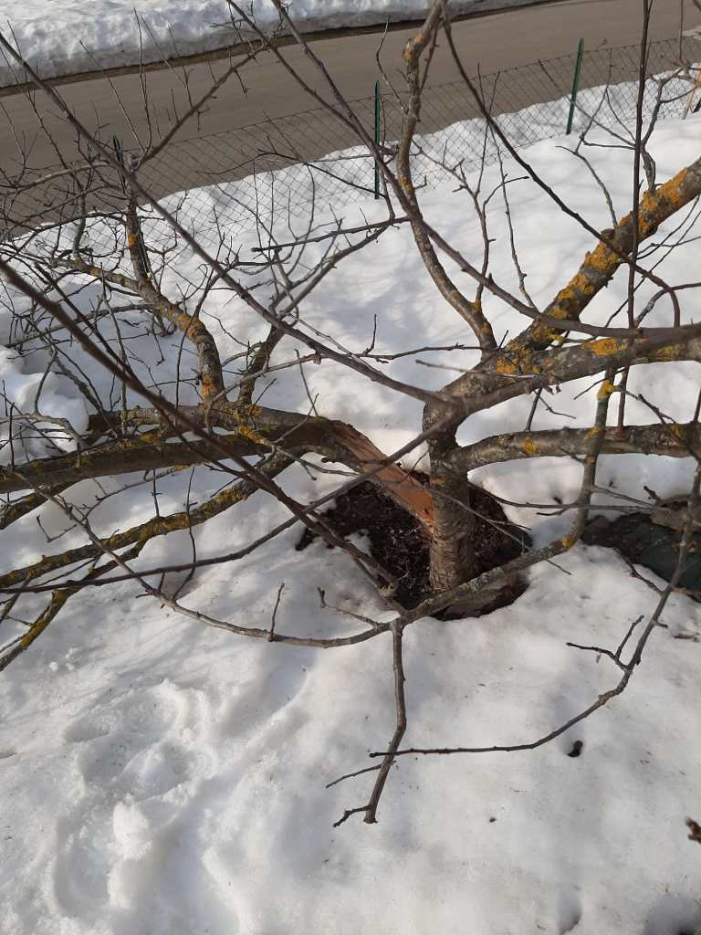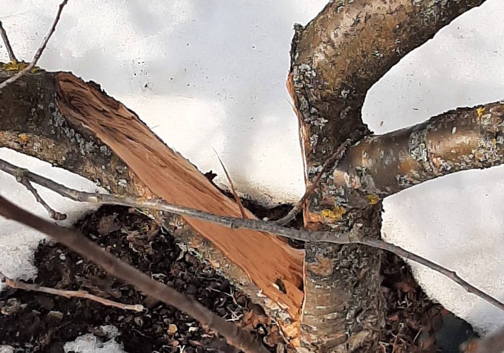 Certo che, caro il mio melo, i tuoi due rami principali che partivano dal fusto hanno subito una forte lacerazione. Il grande peso della neve ha aperto una grossa ferita fin nel tuo fusto, dividendoti quasi in due.
